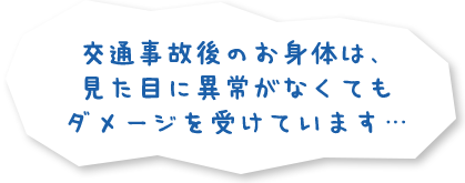 車の衝突により首が受けた衝撃は、首の骨のズレとして残ります。そのため、一見ケガなどの異常がなくとも、頭痛、めまい、吐き気、手足のしびれ、背中や腰の痛みなど身体の不調が出てしまうのです。