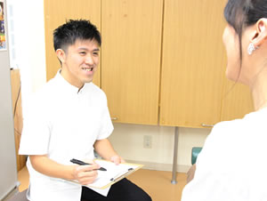初めて来られる方には、必ず最初に交通事故治療のしくみと、事故状況の確認、お身体の検査を行います。
